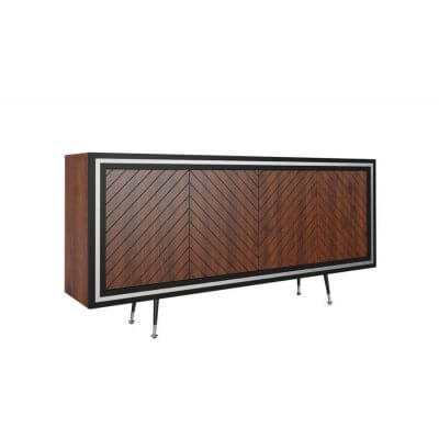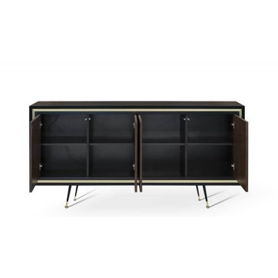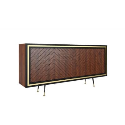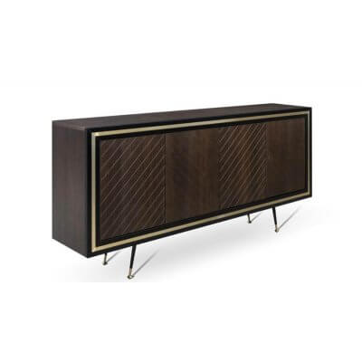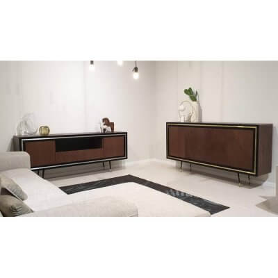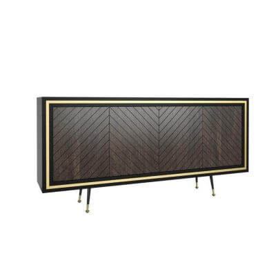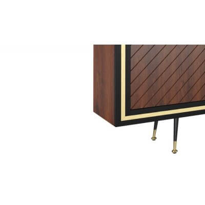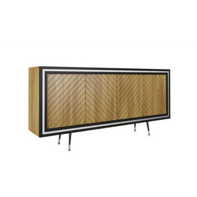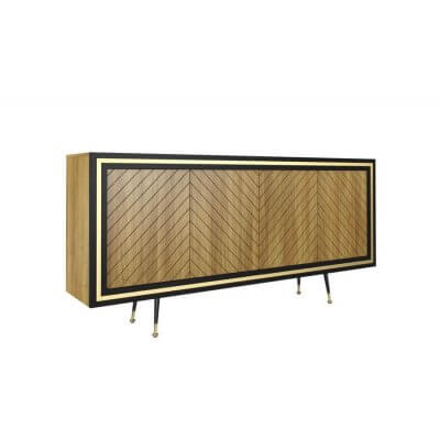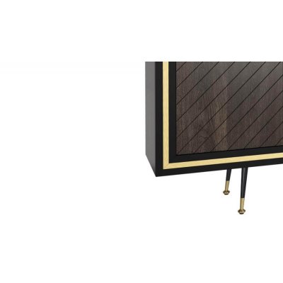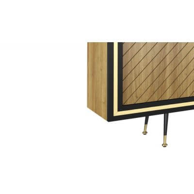 Komoda, dębowa o teksturze wykończenia w jodełkę. Nie posiada uchwytów do otwierania (system push to open). Ramka komody w kolorze czarny półmat. Wypełnienia ramek i zakończenia nóżek w kolorach złotym i srebrnym.