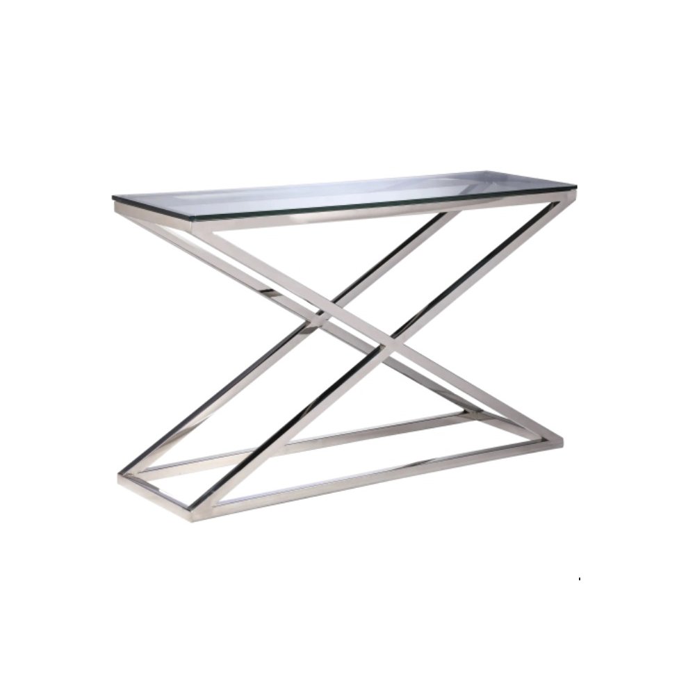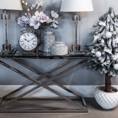 Konsola New Yorker posiada podstawę wykonaną z polerowanej stali nierdzewnej, dostępną w dwóch kolorach (złota lub srebrna).
