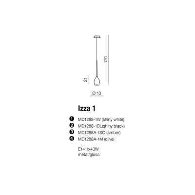 Lampa Izza 1 wykonana jest z metalu (podsufitka, linki, oprawa oświetleniowa) oraz szkła w kolorze białym (klosz). Ma miejsce na jedno źródło światła, które zapewni doskonałą jasność w mniejszych i większych pomieszczeniach. Istnieje możliwość skracania jej długości. Lampa ta jest świetnym rozwiązaniem do salonu lub sypialni. Źródła światła w tej lampie to żarówka E14 (tzw. mały gwint) o maksymalnej mocy 40W.