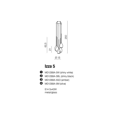 Lampa Izza Black wykonana jest z metalu oraz szkła. Źródła światła w tej lampie to cztery żarówki typu E14 (mały gwint) o maksymalnej mocy 40W.