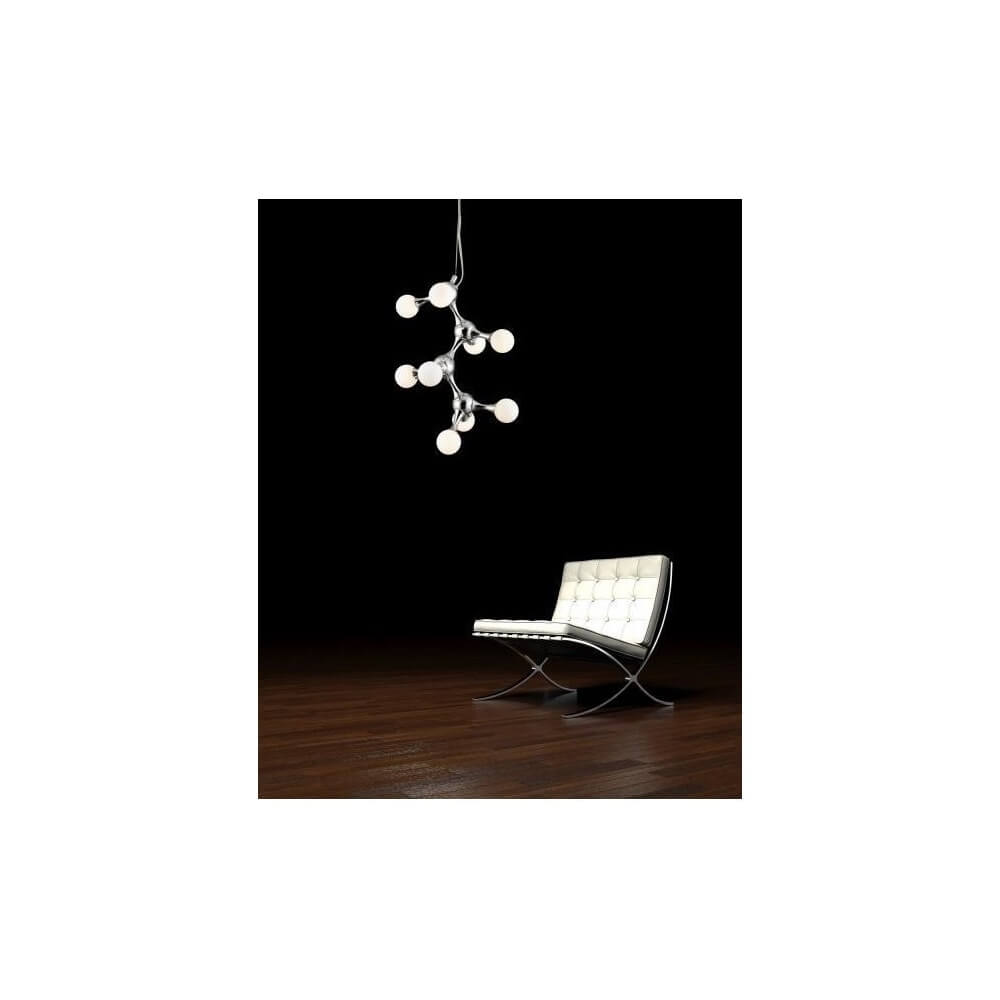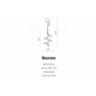Lampa Neurono wykonana jest z metalu oraz szkła. Źródła światła w tej lampie to dziewięć halogenów typu G4 o maksymalnej mocy 20 W 12V (transformator wbudowany w lampę). W przypadku wyboru wersji LED lub chęci zastosowania żarówek ledowych modyfikacja transformatora wydłuży wysyłkę lampy o 2-3 dni robocze.