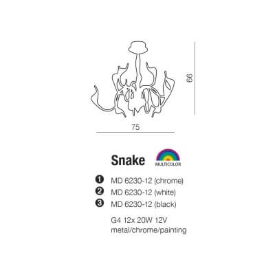 Snake w całości wykonany jest z chromowanego metalu. Źródło światła oświetlenia to 12 halogenów typu G4 o maksymalnej mocy 20W. Źródła światła dołączone są do zestawu wraz z instrukcją montażu.