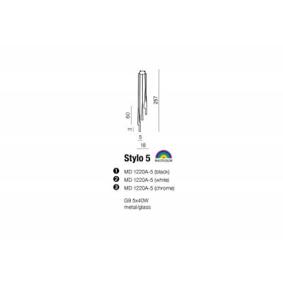 Lampa Stylo 5 Chrom wykonana jest z chromowanego metalu oraz szkła w kolorze białym (klosze). Źrodła światła w tej lampie to pięć halogenów typu G9 o maksymalnej mocy 40W.