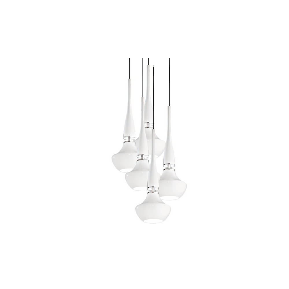 TASOS 5 to lampa wisząca wykonana z chromowanego metalu oraz białego szkła. Źródłem światła w lampie jest 5 żarówek E14 (tzw. mały gwint) o maksymalnej mocy 40W Oprawa posiada 24 miesięczna gwarancję.