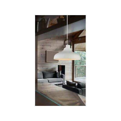 Lampa Tessio to lampa w stylu industrialnym, wykonana z metalu w kolorze białym, ozdobiona skórzanymi elementami. Idealna do każdego nowocześnie urządzonego wnętrza.
