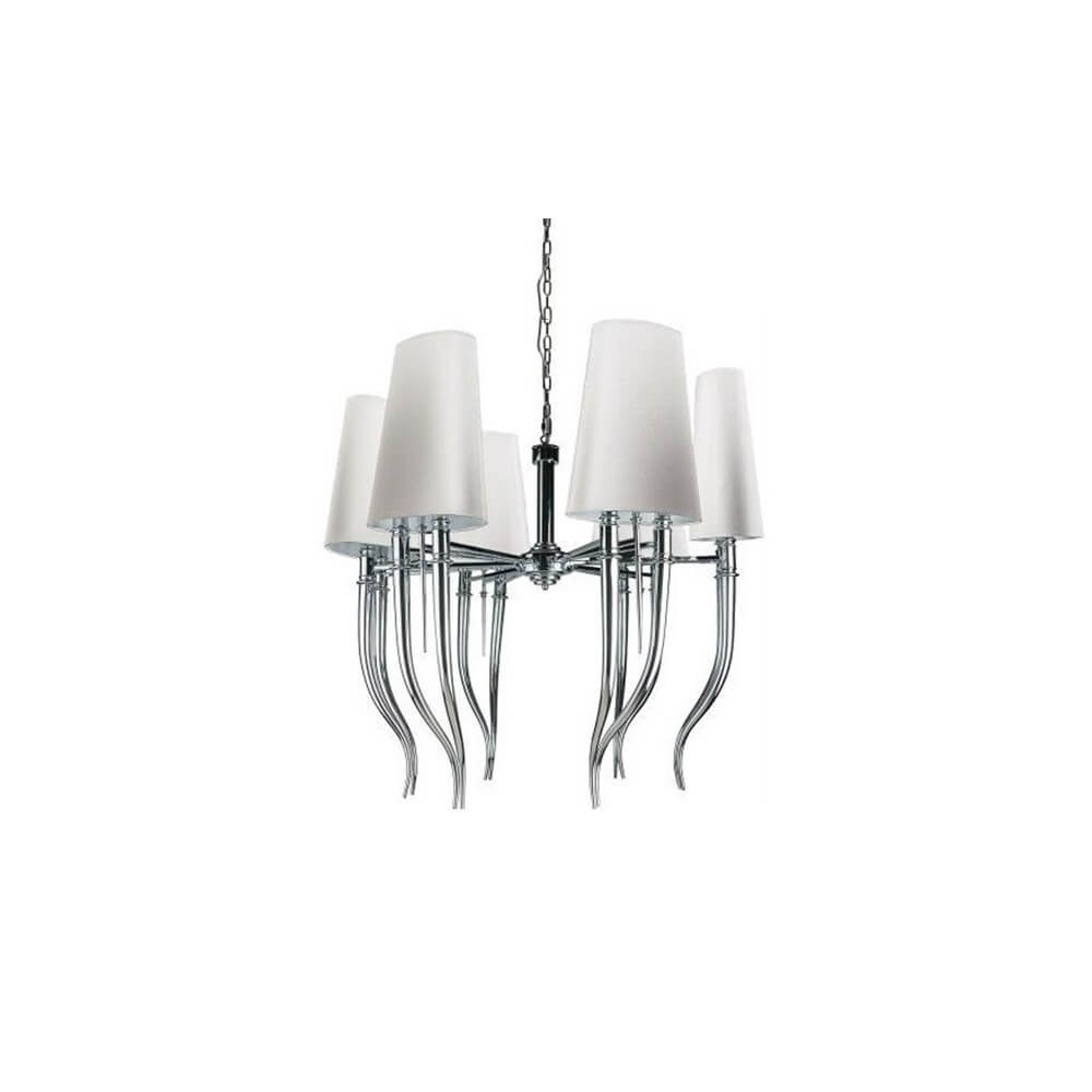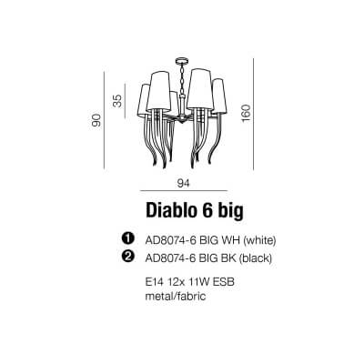 Lampę wiszącą Diablo wykonano z chromowanego metalu, zaś do abażurów użyto białej tkaniny o wysokiej jakości. Żyrandol ma aż 230 cm wysokości, w tym 80 cm mierzy łańcuch zawieszający. Jest szeroki na 76 cm, zaś nieco asymetryczne klosze wysokie są na 30 cm. Metalowe zdobienia przypominają z wyglądu rogi, subtelnie wymodelowane.