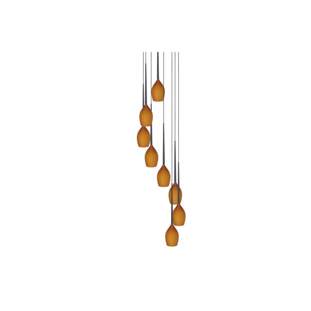Lampa wisząca Izza to prosta oprawa wykonana z metalu oraz szkła. Składa się z ośmiu kloszy na osobnych zwisach, przytwierdzonych do metalowej podstawy. Klosze lampy wykonano z ze szkła zabarwionego na bursztynowy kolor. Idealnie pasuje do nowoczesnych wnętrz. Polecana do biur i salonów.