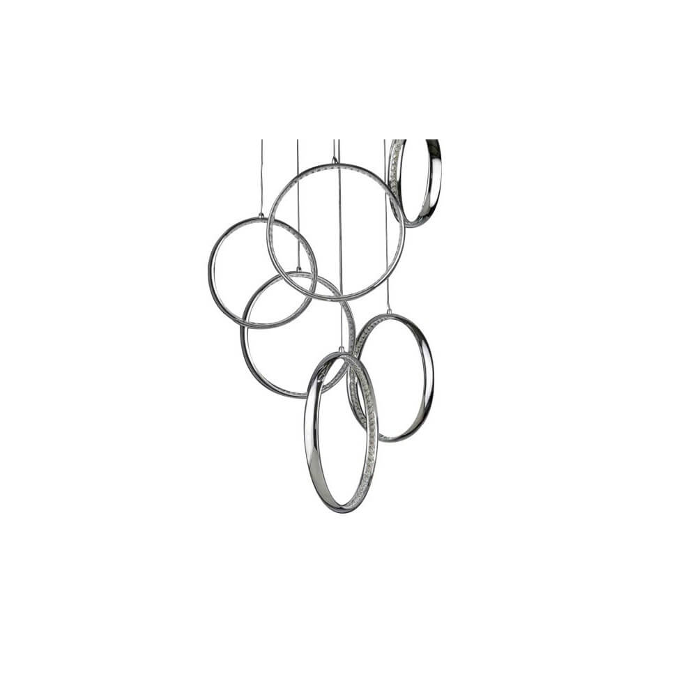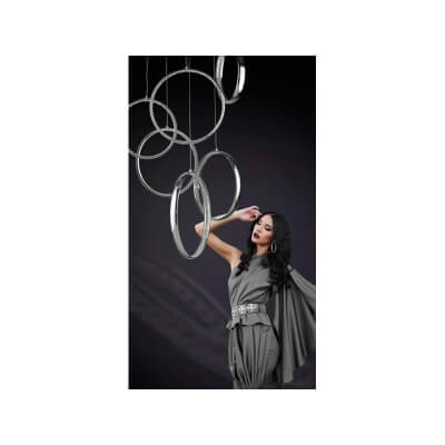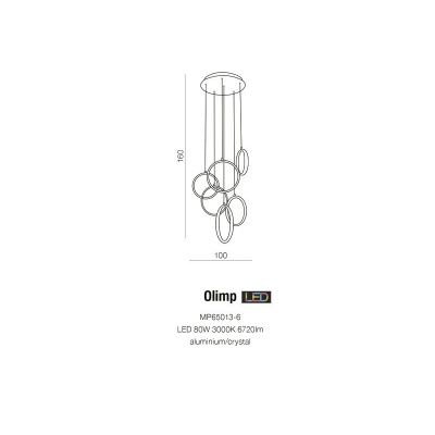 Lampa Olimp jest zaliczana do kategorii lamp wiszących i wyróżnia się ciekawą formą, na którą składa się sześć aluminiowych obręczy, z których każda została zawieszona osobno na okrągłej podsufitce. Obręcze podwieszono na różnej wysokości, a od wewnątrz wyłożono szklanymi kryształkami. Oprawa prezentuje się bardzo dekoracyjne, dlatego we wnętrzu pełni równocześnie funkcje oświetlenia i ozdoby. Odważna, nieregularna forma oprawy to cechy dość częste dla nowoczesnego oświetlenia. Połączenie tej formy z dekoracyjnym designem sprawia, że Olimp znajduje zastosowanie w pomieszczeniach utrzymanych w różnych stylach, w których znaczenie ma elegancja połączona z subtelną dekoracją. Oprawa doskonale sprawdza się we wnętrzach nowoczesnych, glamour, nowojorskich oraz w wielu innych. Może być montowana w pomieszczeniach o różnym przeznaczeniu. Z powodzeniem można ją umieścić nad strefą wypoczynku w salonie i nad stołem w jadalni. Bywa montowana również w sypialni, biurze oraz w wielu innych wnętrzach. Oprawa Olimp została wyposażona w pojedynczy, zintegrowany LED o mocy 80 W oraz napięciu 230 V. Żarówka LED daje strumień świetlny 6720 lm, a temperatura barwowa emitowanego światła wynosi 3000 K (barwa ciepło-biała). Oprawa utrzymana w kolorystyce chromu, prezentuje się modnie i elegancko. Atutem lampy jest możliwość regulacji wysokości, co pozwala dopasować ją do indywidualnych preferencji klienta. Oprawa należy do 7 klasy energetycznej. W sprzedaży dostępna w komplecie z żarówkami LED.