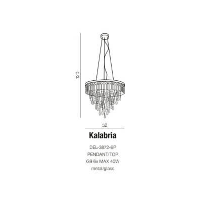 Kalabria stanowi elegancką oprawę oświetleniową z kategorii lamp wiszących. Doskonale wpisuje się w luksusowe i bogato zdobione wnętrza. Wyróżnia się dekoracyjną formą oraz wysokiej jakości materiałem. Jest propozycją dla klientów, którzy preferują pomieszczenia w stylu nowoczesnym, glamour lub nowojorskim, a także nie stronią od bogatych zdobień. Oprawa Kalabria dobrze prezentuje się w eleganckich i luksusowych wnętrzach hoteli, restauracji oraz w bogato wyposażonych biurach. Doskonale wpisuje się także w urządzone z przepychem pomieszczenia mieszkalne. Sprosta wymaganiom reprezentacyjnych części domu, jak i tych, które są przeznaczone na wyłączny użytek domowników. Może zagościć między innymi w salonie, sypialni oraz w wielu innych pomieszczeniach. Oprawa może pełnić funkcję oświetlenia głównego lub strefowego. Często stanowi efektowną dekorację wnętrza. Lampa Kalabria ma 6 źródeł światła o napięciu 230 V. oraz gwint G9, co umożliwia zastosowanie żarówek LED. Jej niewątpliwym atutem jest możliwość regulacji wysokości. Dobrej jakości materiały oraz rzetelne wykonanie produktu stanowią gwarancję trwałości produktu. Lampa Kalabria jest zbudowana z metalu oraz transparentnego szkła (kolor clear). Należy do 5 klasy energetycznej. Sprzedawana bez żarówek w komplecie.