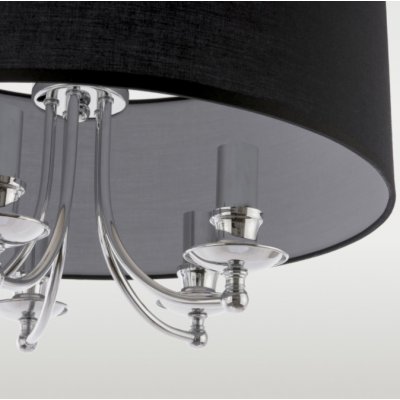 Lampa wisząca Roma wykonana jest z metalu i tkaniny. Lampa jest w kolorze czarnym i srebrnym. Lampa ma chromowane wykończenie i mocowanie źródeł światła na świecznikach.