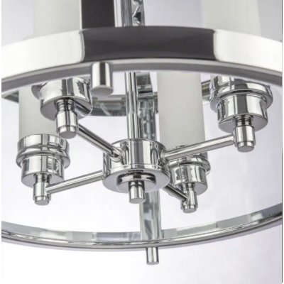 Lampa wisząca New York wykonana jest z metalu i szkła. Lampa jest w kolorze srebrnym. Lampa ma cztery źródła światła osadzone na chromowanych świecznikach.