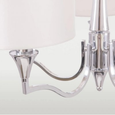 Lampa wisząca Washington wykonana jest z metalu i tkaniny. Lampa jest w kolorze białym i srebrnym. Lampa kształtem ramion nawiązuje do marokańskiej koniczyny oraz ma pięć małych abażurów.