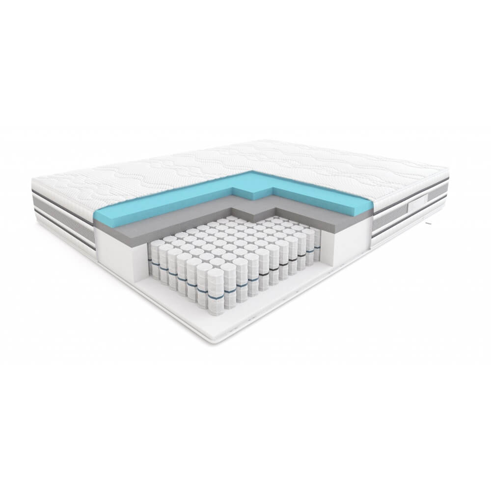 Wkład: 7-strefowa sprężyna kieszeniowa Pocket Plus o wys. 15 cm, od dołu pianka Flexifoam o wys. 3 cm, od góry pianka wysokoelastyczna HR o wys. 4 cm oraz pianka FloFom o wys. 4 cm.