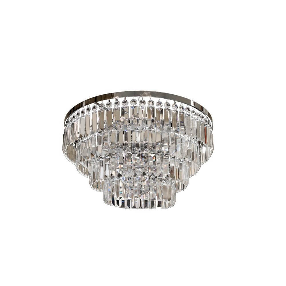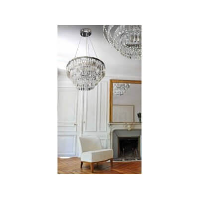 Salerno Top to oprawa z kategorii plafonów. Design lampy doskonale wpisuje się w gusta osób, które preferują dekoracyjne i pełne blasku wnętrza. Ogromne atuty oprawy to zastosowanie wysokiej jakości materiałów oraz solidne wykonanie, które gwarantują jej trwałość. Dekoracyjny wygląd z łatwością wpisuje ją we wnętrza w stylu glamour, nowoczesnym oraz nowojorskim. Plafon Salerno Top znajduje zastosowanie w pomieszczeniach mieszkalnych i komercyjnych. Może ozdobić salon, sypialnię i luksusowo wyposażone biuro. Z powodzeniom wpisze się też w przestrzenie ekskluzywnych hoteli i restauracji. Do wnętrza wprowadza blask, połysk i powiew luksusu. Stanowi nie tylko funkcjonalne oświetlenie, ale również spektakularny element dekoracyjny. Niezwykle efektownie prezentuje się przy włączonym świetle, które przenikając przez szklane kryształki, daje bardzo dekoracyjny efekt. Oprawa Salerno Top została wykonana z wysokiej jakości materiałów – metalu w kolorze chromu oraz transparentnego szkła (kolor clear). Ma 5 źródeł światła o napięciu 230 V. Zastosowany w oprawie gwint typu E14, pozwala na stosowanie żarówek LED. Lampa jest zaliczana do 5 klasy energetycznej. W sprzedaży bez żarówek w komplecie.