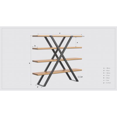 Na metalowej ramie umieszczono cztery długie półki, które tworzą razem kształt równoległoboku.