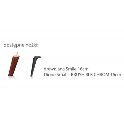 Sofa może stać na nogach drewnianych (dostępnych w kilku wybarwieniach) lub na metalowych w kolorze czarnego chromu.