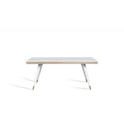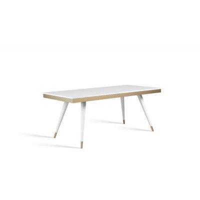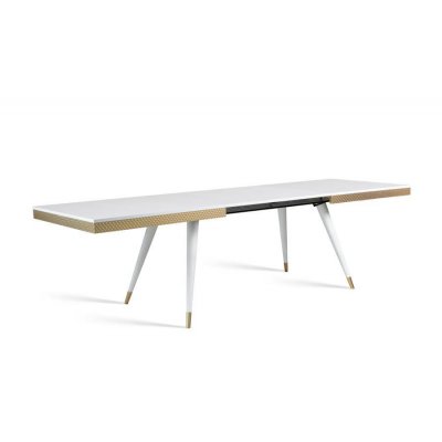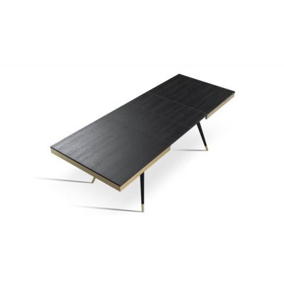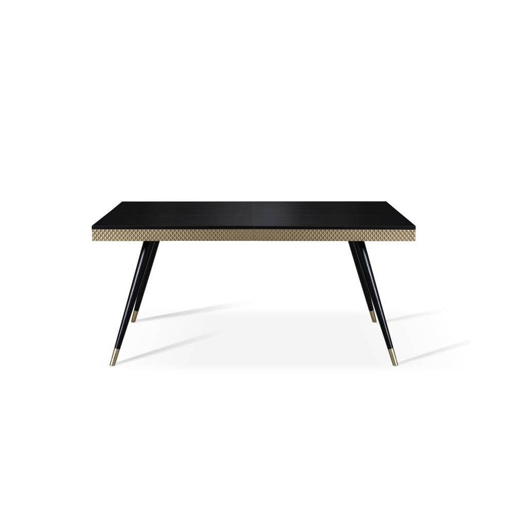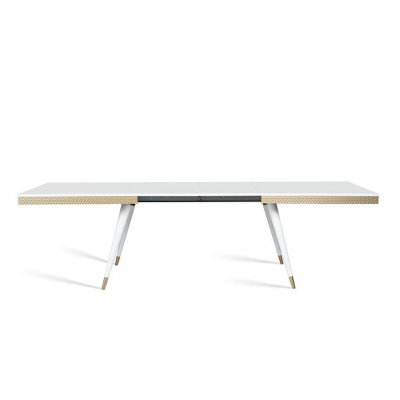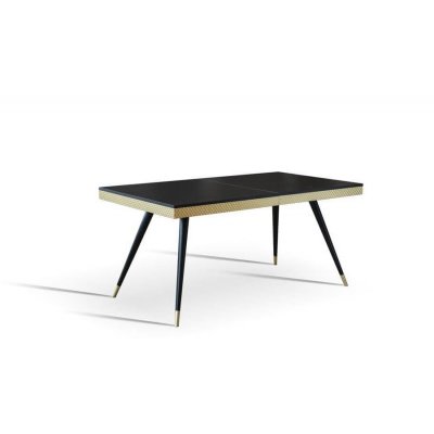 Stół rozkładany Rubin. Blat stołu wykonano z akryluksu i wybarwiono na czarny lub biały połysk. Wokół poprowadzono listwę w kolorze złotym.