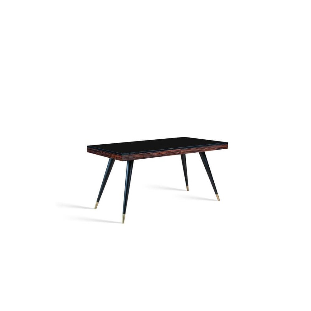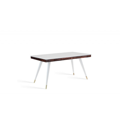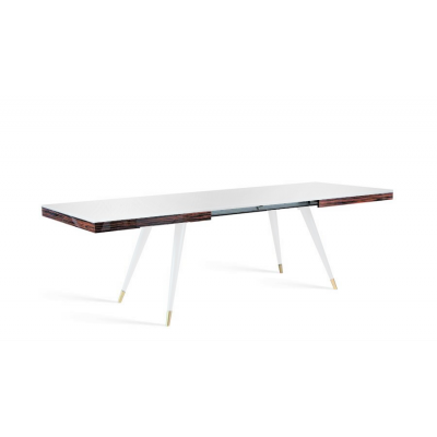 Stół rozkładany Arte. Blat stołu wykonano z płyty w czarnym lub białym połysku. Wokół poprowadzono listwę z hebanu makassar.