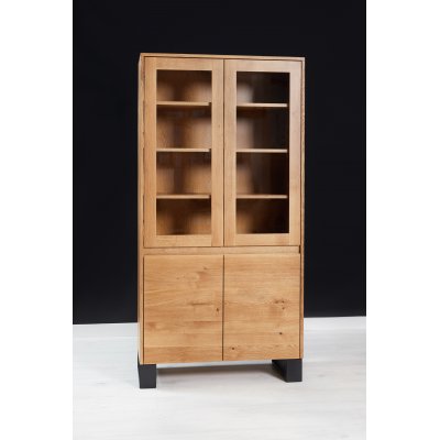 Górne półki schowane są za szybą, a niższe za drzwiami bez uchwytów.